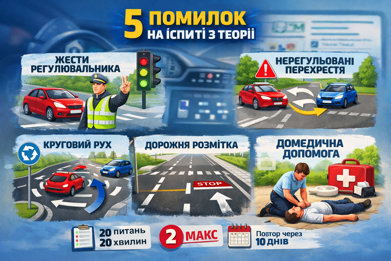Нагадуємо, що теоретичний іспит складається з 20 питань, на які відводиться 20 хвилин. Допускається не більше двох помилок. У разі незадовільного результату повторна спроба можлива через 10 календарних днів — зареєструватися можна на 11-й день після іспиту. Цей період надається для якіснішої підготовки та опрацювання складних тем.